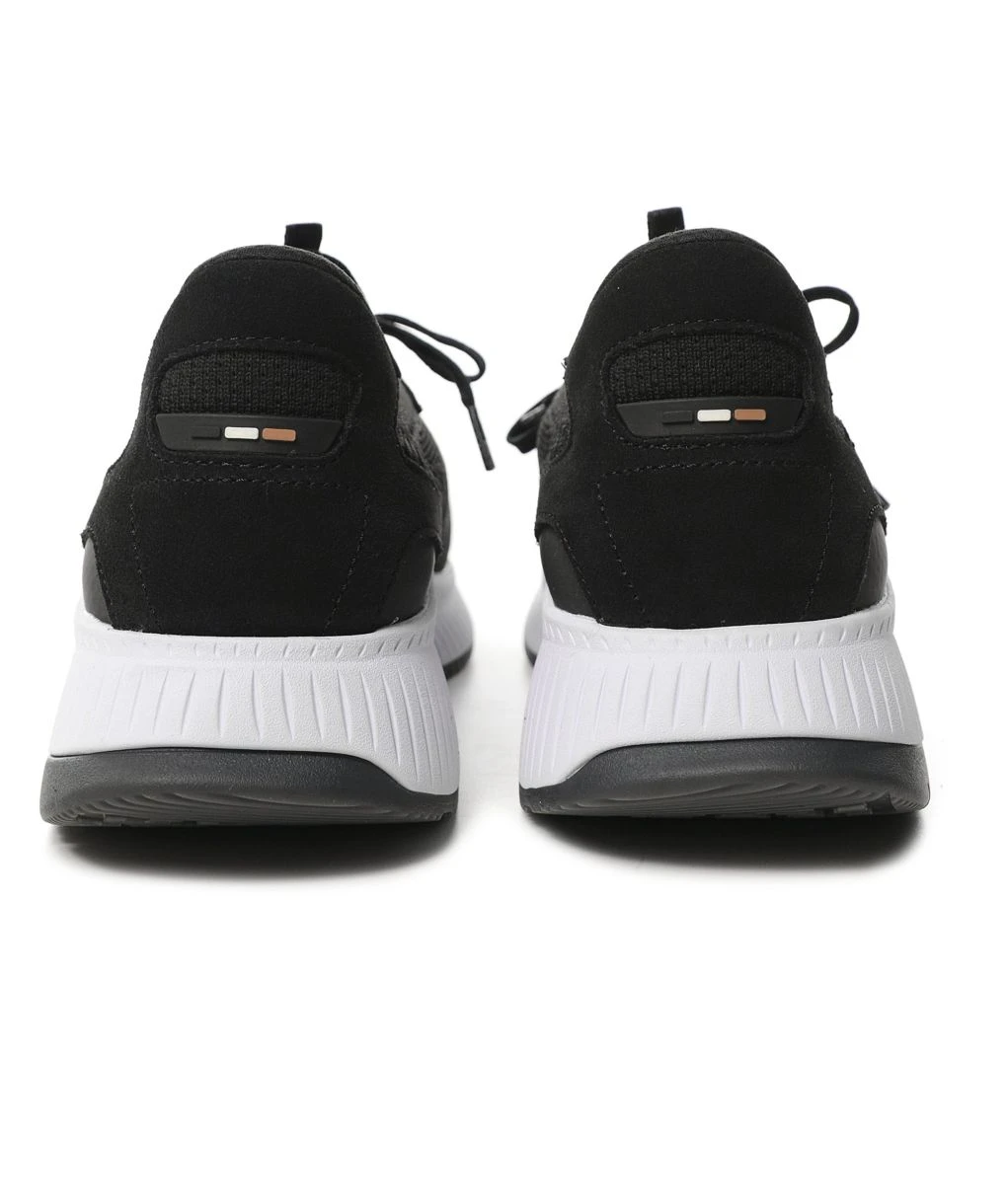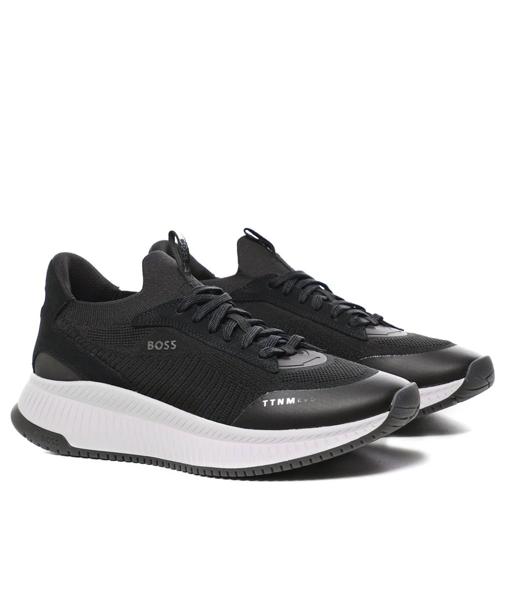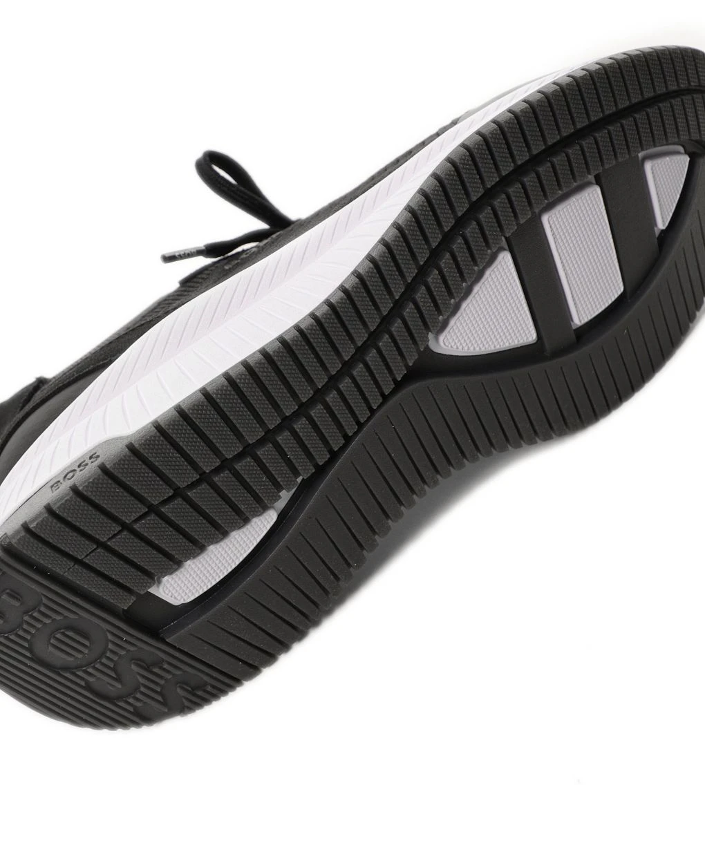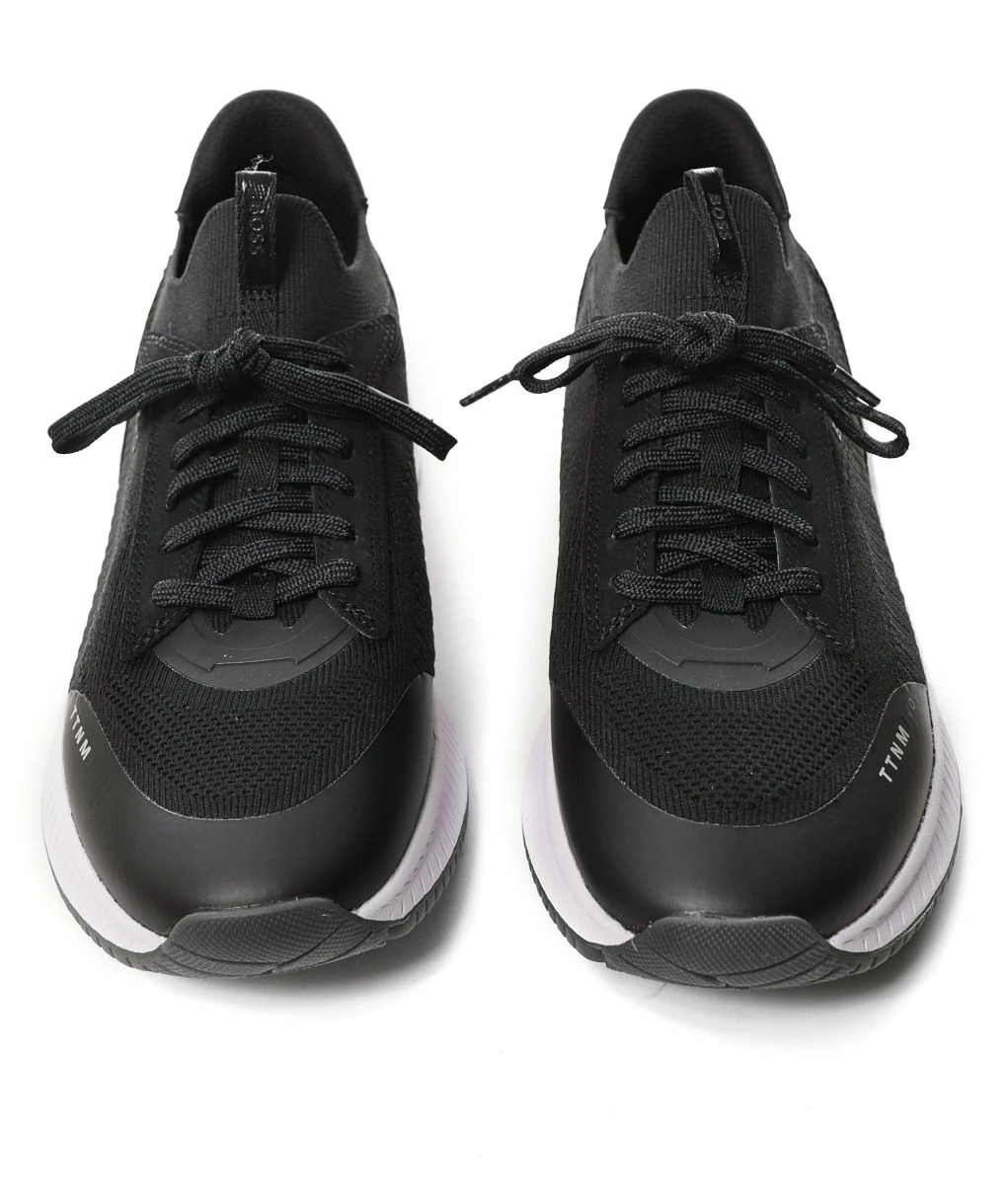 The BOSS knitted trainers are a sock-style option packed with sporty attitude. Engineered in soft knitted uppers, the black sneakers are partially crafted using recycled plastic bottles for a sustainable approach to manufacturing. Featuring a lace-up fastening, panelled design and iconic branding, whilst the fishbone sole ensures superb comfort and traction with every step.
