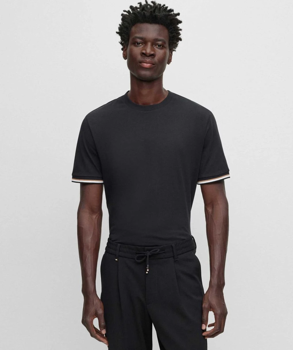 Upgrade your casual basics with the BOSS Thompson 04 t-shirt. Cut to a regular fit, the simple t-shirt has been crafted in pure cotton jersey for optimum comfort and breathability. Featuring a classic crew neck and short sleeves, with the label’s signature stripes adorning the cuffs for an authentic finish.