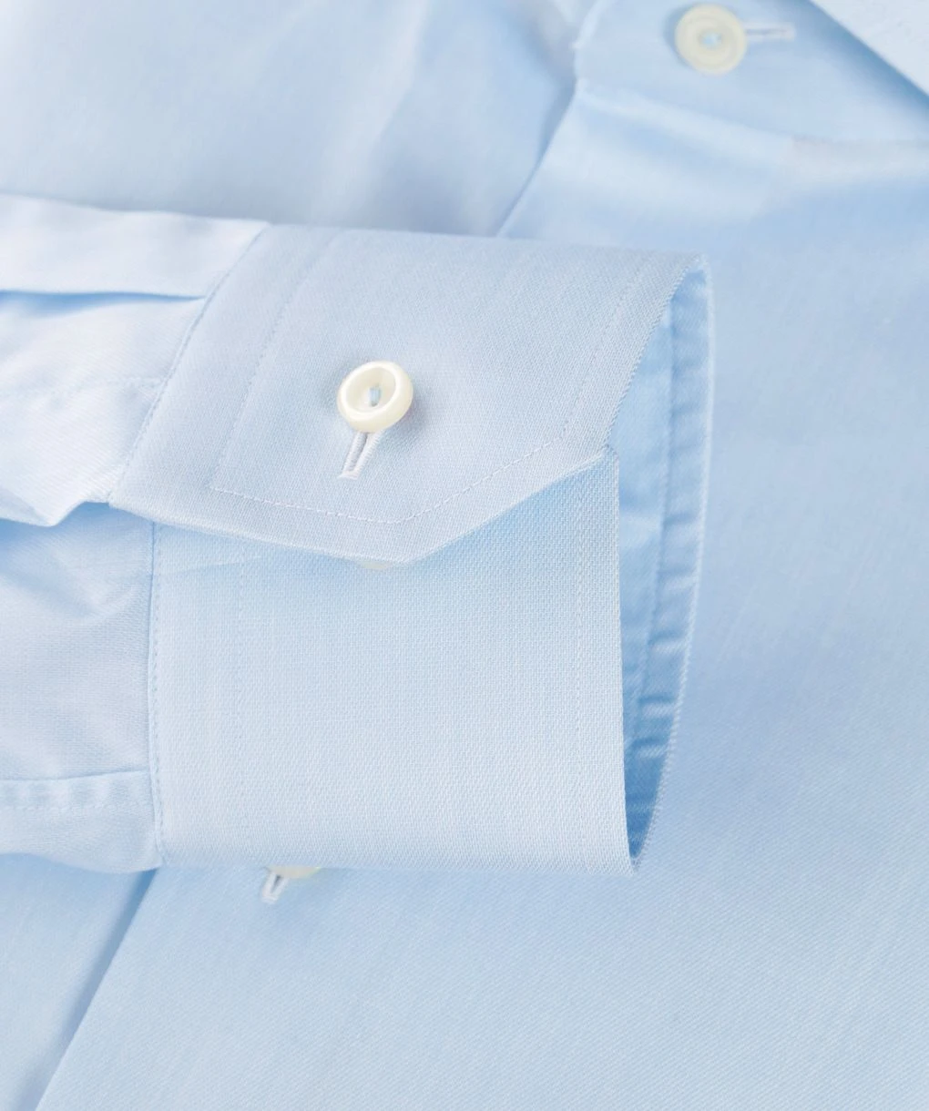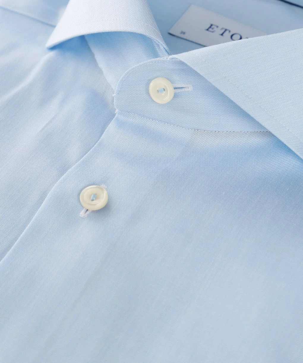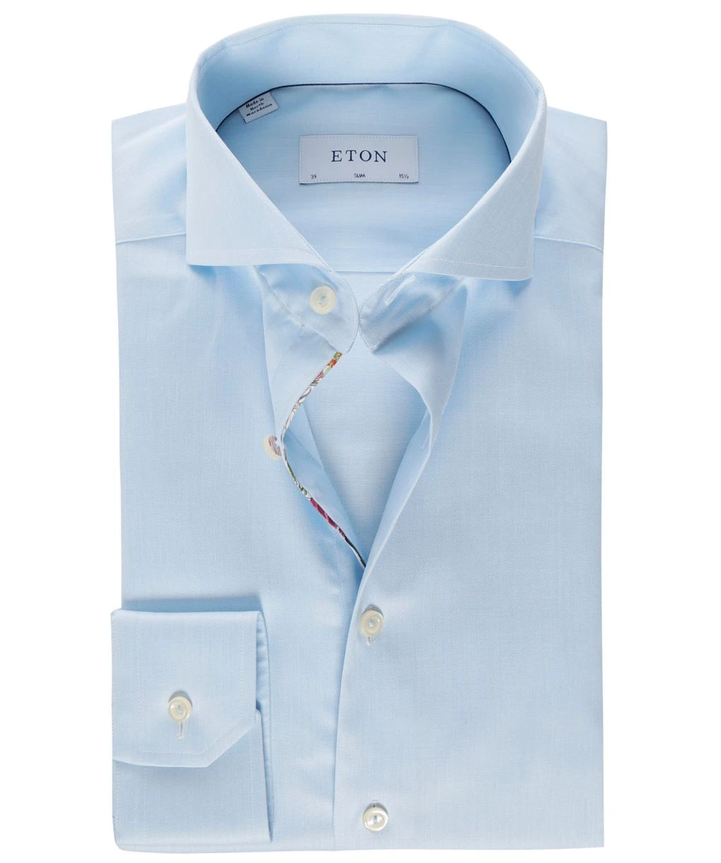 The Eton twill shirt is a stylish choice for your business attire. Cut to a slim fit and expertly engineered in pure cotton twill, the light blue shirt promises a superb drape and flattering silhouette. Featuring a pointed collar, French placket and adjustable buttoned cuffs, whilst the floral placket trim lends charming subtle detail.