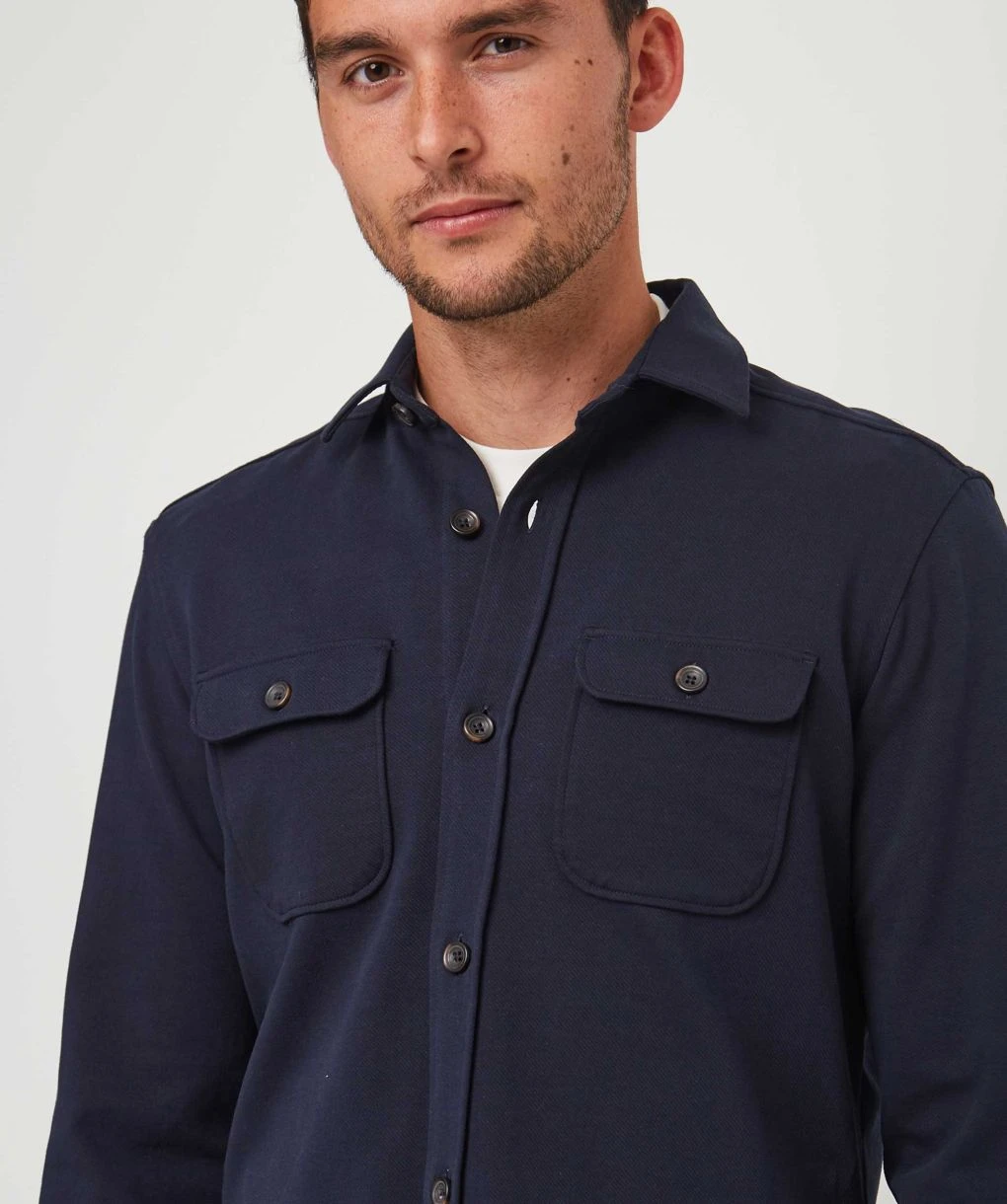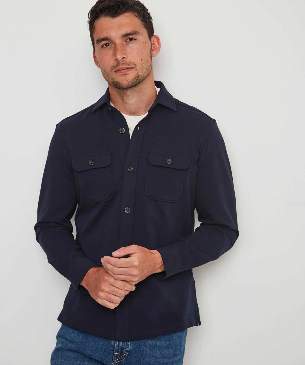 The Hackett jersey overshirt draws inspiration from classic workwear. Engineered in a double faced jersey, the overshirt offers essential warmth and a super soft handle. Featuring a pointed collar, buttoned cuffs and buttoned chest pockets, with the oversized buttons enhancing the utilitarian design.