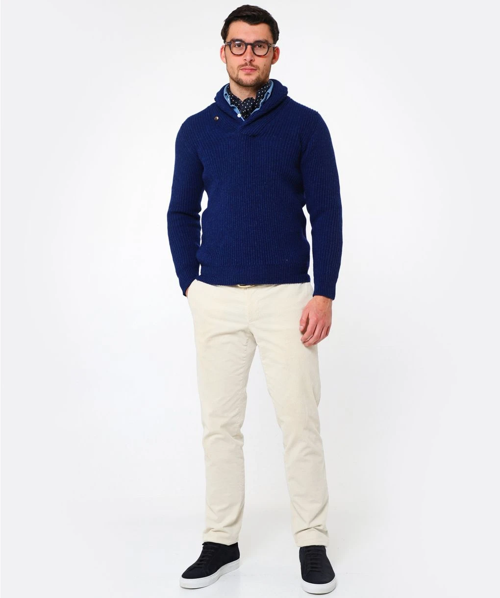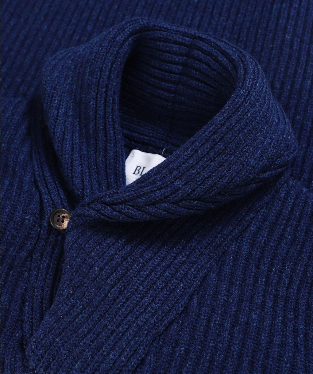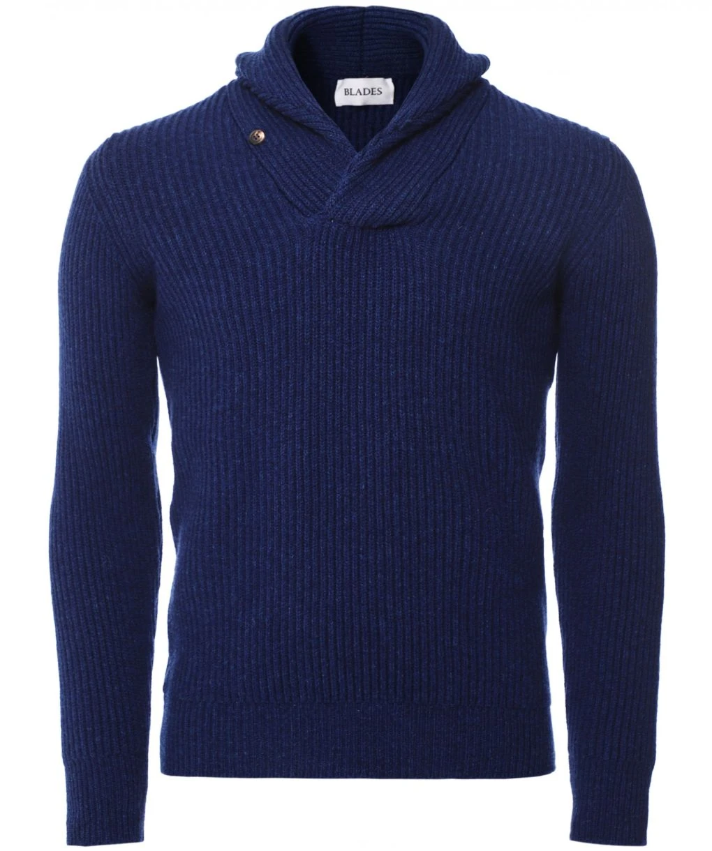 Taken from our very own in-house menswear collection, the J. Blades Cairn jumper is a classic piece of knitwear ideal for cosy winter layering. Lovingly crafted in Scotland using the finest lambswool yarn, the sweater has been designed in a rib knit promising day-long comfort and essential warmth. The jumper showcases a versatile deep blue hue, whilst the shawl collar is complete with a further button and loop fastening to keep the chills at bay.