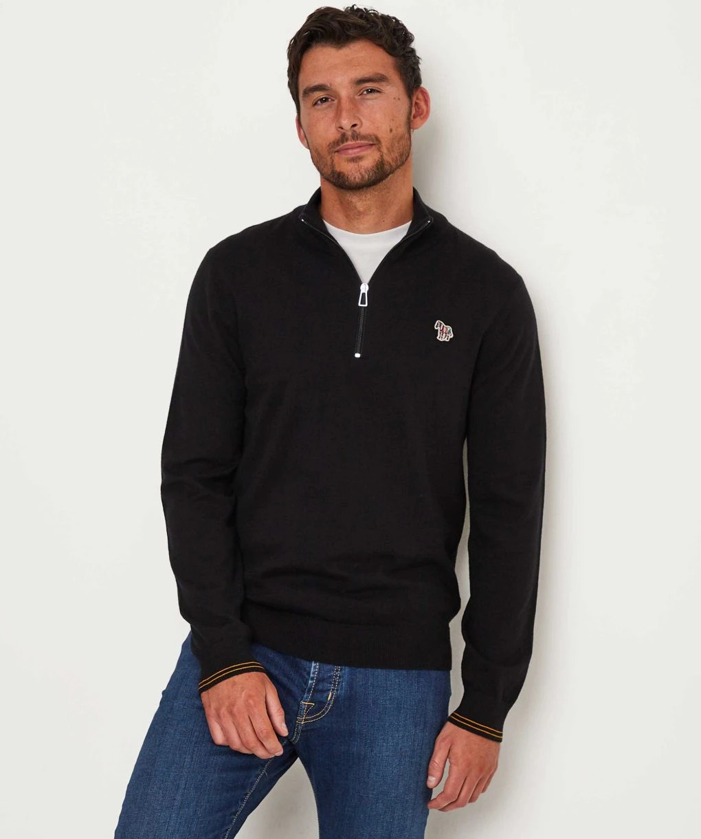 The Paul Smith half-zip Zebra jumper is the ideal layering piece for shirting or tees. Engineered in a knitted cotton rich blend with wool, the sweater promises essential warmth and a super soft handle. Featuring a funnel neck with half-zip fastening and ribbed trims, whilst the brand’s iconic Zebra is embroidered to the chest in vibrant colours.